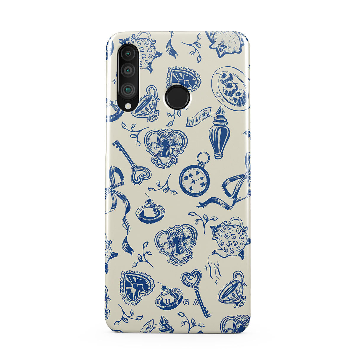Dieses Design enthält: Teetassen, Teekannen, Taschenuhren, Schlüssel, Herzen, Keramik, blau-weißes Muster