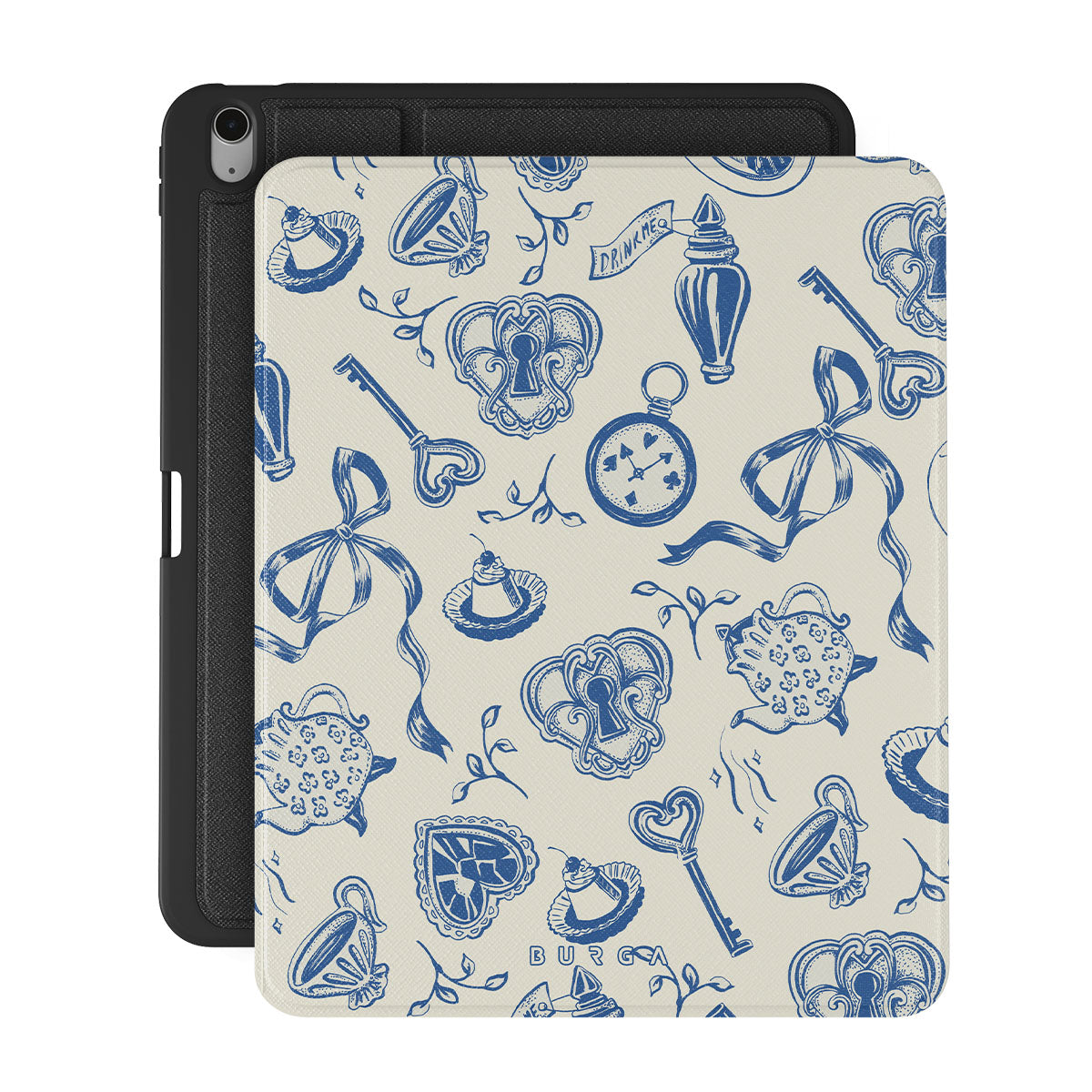 Dieses Design enthält: Teetassen, Teekannen, Taschenuhren, Schlüssel, Herzen, Keramik, blau-weißes Muster