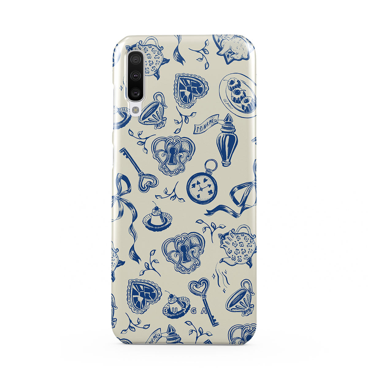 Dieses Design enthält: Teetassen, Teekannen, Taschenuhren, Schlüssel, Herzen, Keramik, blau-weißes Muster