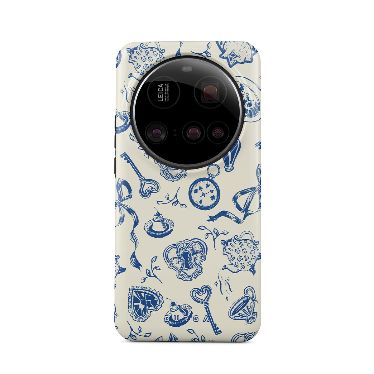 Dieses Design enthält: Teetassen, Teekannen, Taschenuhren, Schlüssel, Herzen, Keramik, blau-weißes Muster