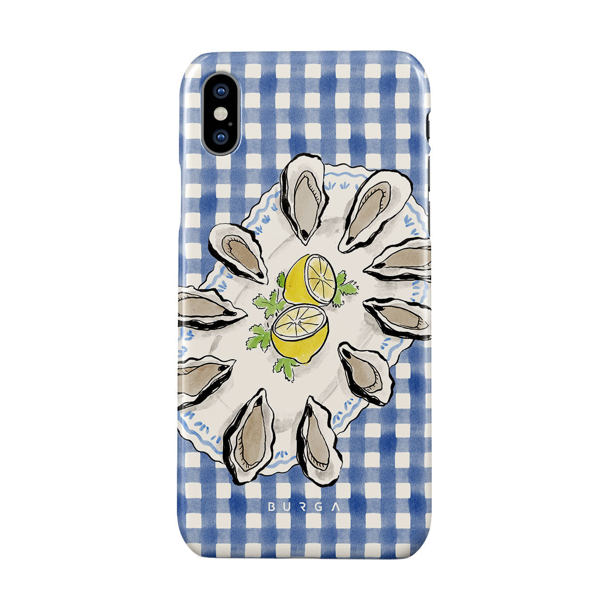 Dieses Design enthält: Austern, Zitrone, blaues Gingham-Muster, frische Küstenelemente, sanfte Pastelltöne.