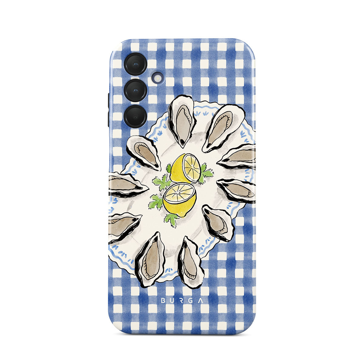 Dieses Design enthält: Austern, Zitrone, blaues Gingham-Muster, frische Küstenelemente, sanfte Pastelltöne.