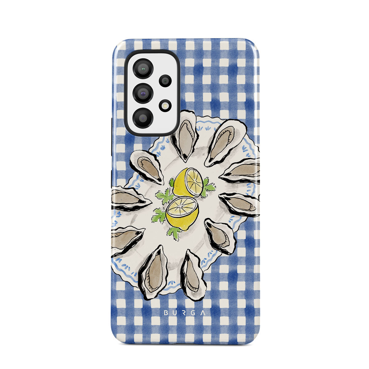 Dieses Design enthält: Austern, Zitrone, blaues Gingham-Muster, frische Küstenelemente, sanfte Pastelltöne.