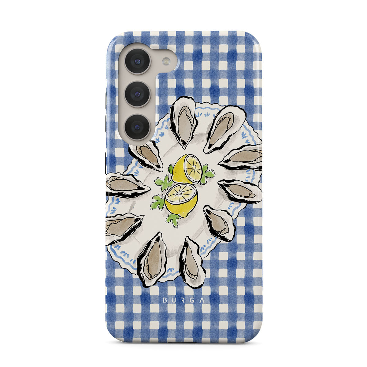 Dieses Design enthält: Austern, Zitrone, blaues Gingham-Muster, frische Küstenelemente, sanfte Pastelltöne.