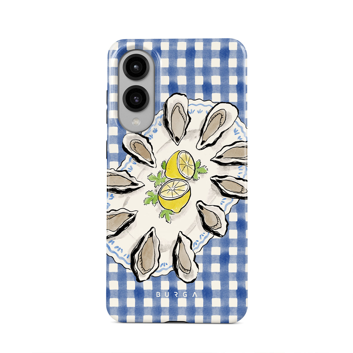 Dieses Design enthält: Austern, Zitrone, blaues Gingham-Muster, frische Küstenelemente, sanfte Pastelltöne.