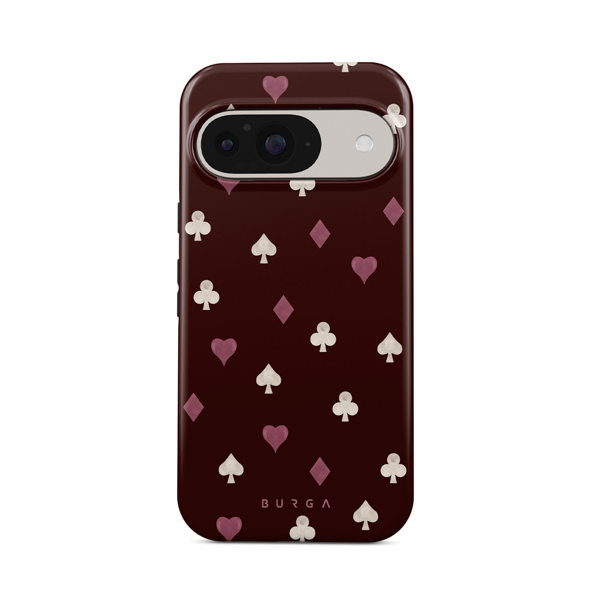 Dieses Design enthält: Spielkartensymbole, Herzen, Pik, Karo, Kreuz, bordeauxroter Hintergrund