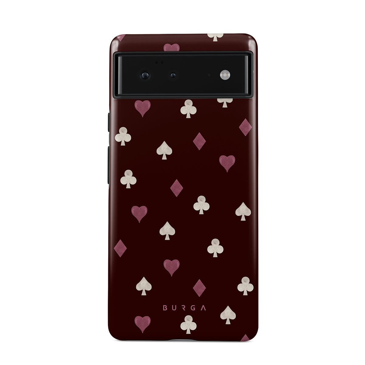 Dieses Design enthält: Spielkartensymbole, Herzen, Pik, Karo, Kreuz, bordeauxroter Hintergrund