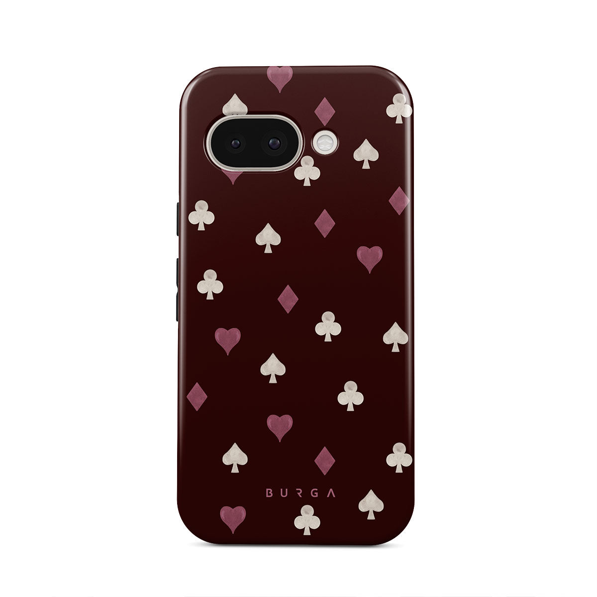Dieses Design enthält: Spielkartensymbole, Herzen, Pik, Karo, Kreuz, bordeauxroter Hintergrund