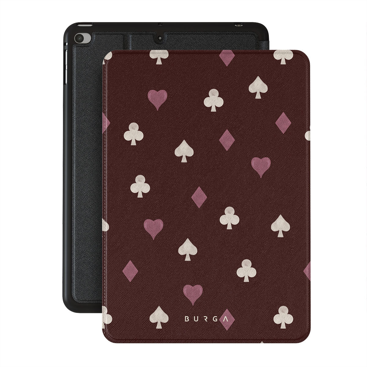 Dieses Design enthält: Spielkartensymbole, Herzen, Pik, Karo, Kreuz, bordeauxroter Hintergrund