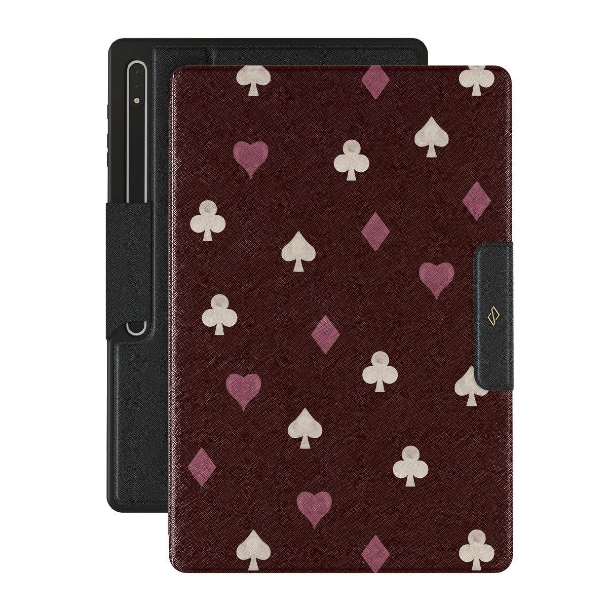 Dieses Design enthält: Spielkartensymbole, Herzen, Pik, Karo, Kreuz, bordeauxroter Hintergrund